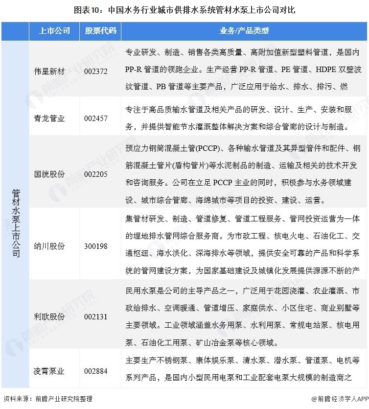 目前我国供排水管材水泵上市企业主要有伟星新材、青龙管业等管材上市公司;国统股份、纳川股份等集管材和供排水建设的上市公司;利欧股份、凌霄泵业等水泵上市公司。其中,伟星新材是国内PP-R管道的重点企业之一;利欧股份是中国在大分微型小型水泵制造商和出口商,先后为国内五大发电公司、武汉钢铁、中国水利电力、中国寰球、中国石化、中国石油、南水北调工程淮河治理工程、引黄济青工程、引滦入津工程、苏丹尼罗河泵站、印度尼西亚南望热电厂等服务。